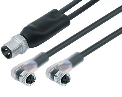 4/3 Way Split Cable Assembly, M12 (A-Coded) Straight Male to 2 x M8 (A-Coded) Angled Female, 2m Cable with Black PUR Jacket, with LED PNP, IP67 (765 Series)