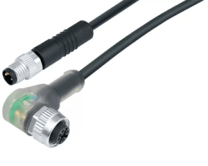 4 Way Cable Assembly, M12 (A-Coded) Angled Female to M8 (A-Coded) Straight Male, 1m Cable with Black PUR Jacket, with LED PNP, IP67 (765 Series)