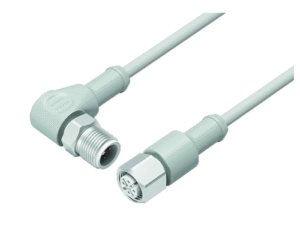 3 Way M12 (A-Coded) Cable Assembly, Angled Male to Straight Female, 2m Cable with Grey PVC Jacket, Stainless Steel Coupling Area, Food & Beverage Version, IP67 & IP69K (763 Series)