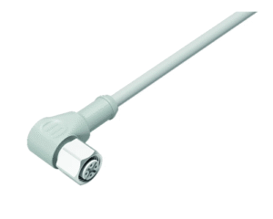 3 Way M12 (A-Coded) Cable Assembly, Angled Female to Open End, 2m Cable with Grey TPE Jacket, Stainless Steel Coupling Area, Food & Beverage Version, IP67 & IP69K (763 Series)