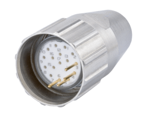 The waterproof connectors are sealed to IP67 and IP69K in mated conditions, and therefore ensure an excellent and constant sealed connection. Cable connectors are available in both straight or angled orientation with various pin counts ranging from 6 to 19 providing a current carrying capacity of up to 20A.